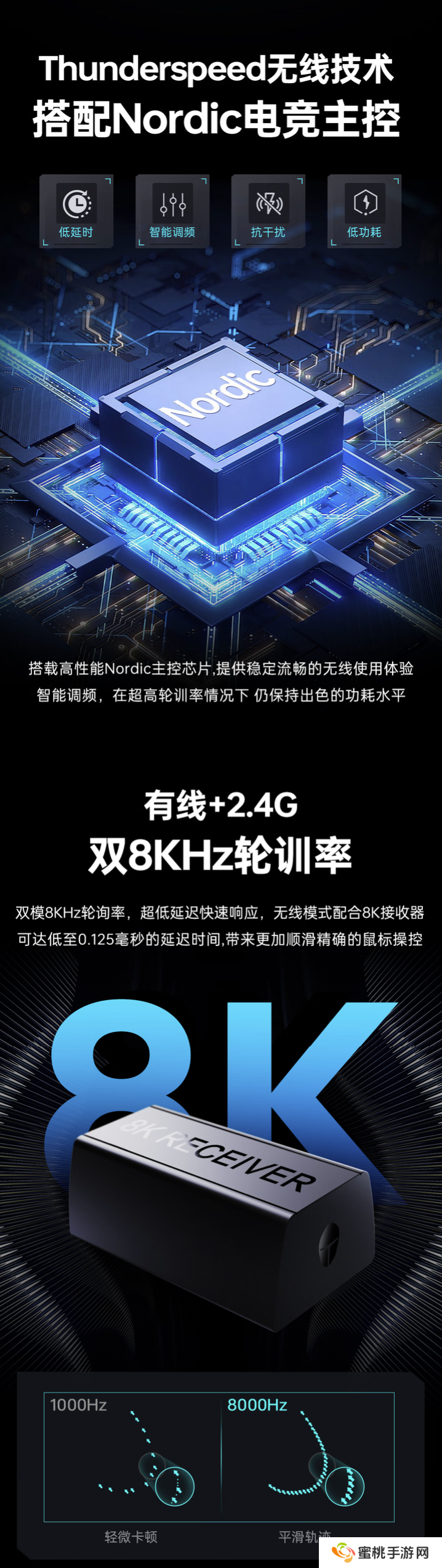规格方面,该鼠标配备PAW3950 PRO传感器,支持双8KHz回报率,同时搭载Thunderspeed无线技术及 Nordic 电竞主控,内置 400 毫安时电池,至高拥有 110 小时续航。
