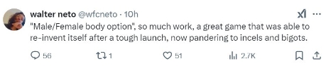 有人说:“‘恢复男/女性别选项’真是费尽心机,现在这款游戏重塑了自己,迎合那些非自愿独身者和偏执者。”