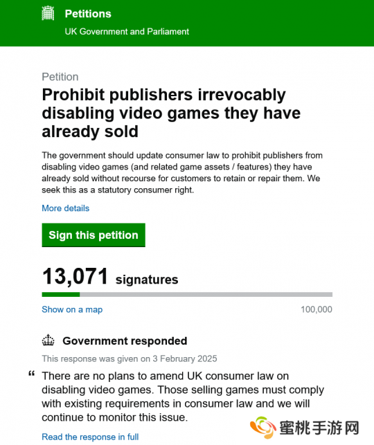 英国官方拒绝玩家实时服务游戏关服后保持可玩立法诉求
