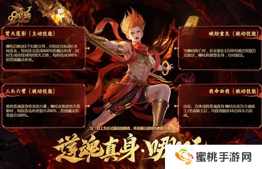 主动技能“焚天莲影”可让哪吒召唤分身对目标发动6段连击,炽焰般的攻击过后还将在范围内留下焚天烈焰,对进入阵内的对手持续造成魔法伤害。当哪吒阵亡时,被动技能“破劫重生”可重现哪吒金身重塑的不灭斗志,1分钟后即可复活归来。而哪吒的“三头六臂”则成为了突破伤害上限的被动技能,借助莲魂真身带来的力量,让哪吒“焚天莲影”的输出得以提升。而当“莲魂真身·哪吒”出征、合体或被任命为斗魂骑士/**骑士时,“我命由我”的战魂战技也将被激活,获得最为简单粗暴的额外战斗力加成!