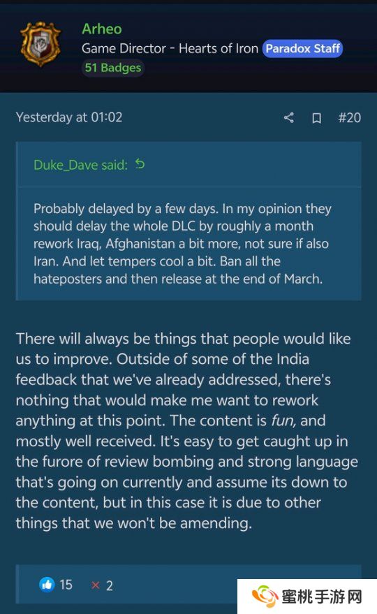 尽管中国玩家呼声很高,但并没有取得太好的效果。在质疑声中,《钢铁雄心4》只是将丝绸之路改为了帖木儿之路。《钢铁雄心4》的游戏总监,后续发布动态,拒绝调整更多具有争议性的内容,也没有对之前的事情道歉。