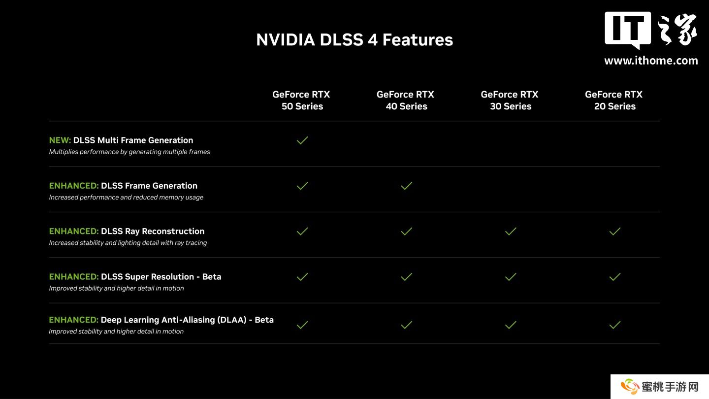 DLSS 4 是英伟达硬件独占的功能套件,包含多帧生成、帧生成、光线重建、超分辨率、DLAA(深度学习抗锯齿)、Reflex Low Latency 以及 NVIDIA Image Scaling 图形增强等多项技术。需要注意的是,尽管 DLSS 4 支持从 RTX 20 系列开始的显卡,但并非所有功能都适用于旧显卡。