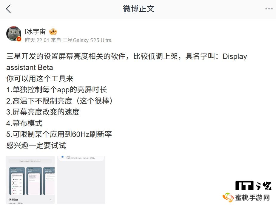 本站 3 月 11 日消息,据博主@i冰宇宙 分享,三星开发的屏幕亮度设置软件“Display Assistant Beta”低调上架,该款应用支持用户单独控制 App 亮屏时长、限制刷新率等。