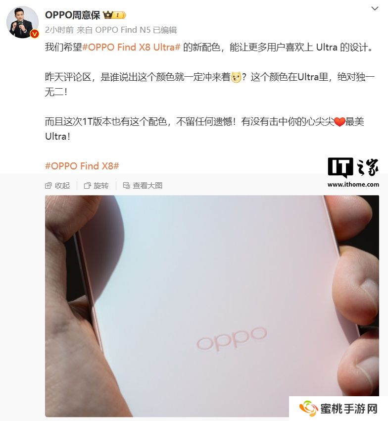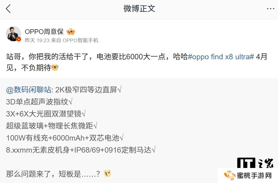 OPPO Find 系列产品负责人周意保转发了该微博,明确表示新机电池比 6000mAh“大一点”,即>6000mAh,并预告 OPPO Find X8 Ultra 手机“4 月见”。由此来看博主爆料机型为 Find X8 Ultra。