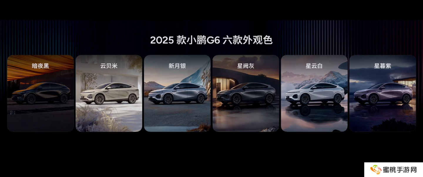 2025 款小鹏 G6 拥有 6 款外观颜色 ——星暮紫,云贝米,新月银,星阙灰、星云白、暗夜黑,还有更深邃的黑武士涂装。新车车头升级了全贯穿头灯,车尾则配备上扰流板、全新鸭尾、后保险杠 C 环的全新设计,使车头到车尾的光影线条更加流畅。