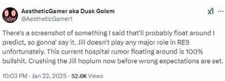 近日Dusk Golem发推文评论了《生化危机9》最近的传言。他表示吉尔不会在游戏中扮演重要角色,目前网上流传的“医院”剧情完全是虚假的,关于这款游戏的绝大多数传言也是假的。