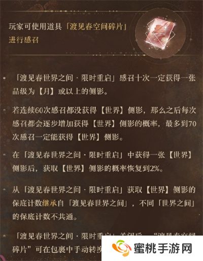 「渡见春」世界等级侧影感召概率限时提升,玩家仅可使用道具「渡见春空间碎片」进行感召。