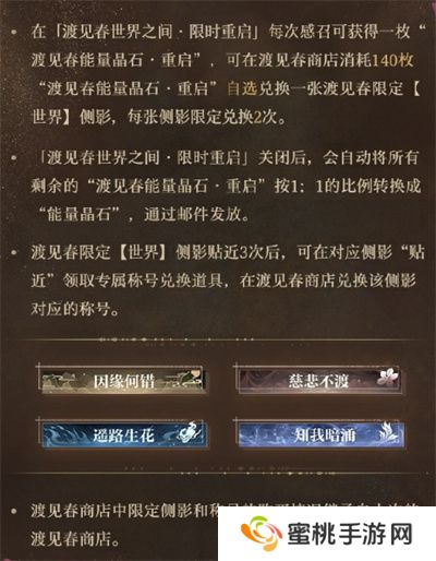 1月15日-1月22日,「渡见春」系列世界等级侧影【顾时夜 · 因缘何错】【易遇 · 慈悲不渡】【柏源 · 遥路生花】【夏萧因 · 知我暗涌】限时重启,届时玩家可使用「渡见春空间碎片」进行感召。本期「渡见春」重启后,感召次数、保底计数,将从往期「渡见春世界之间」中继承。