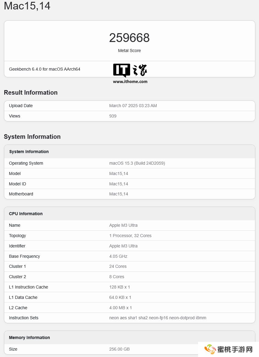 在 Geekbench 6 的测试中,搭载 M3 Ultra 芯片的 Mac Studio 在 Metal 测试中获得了 259668 分,较上一代 M2 Ultra 芯片的 222582 分提升了 16%,意味着 M3 Ultra 成为苹果有史以来图形性能最强的芯片。