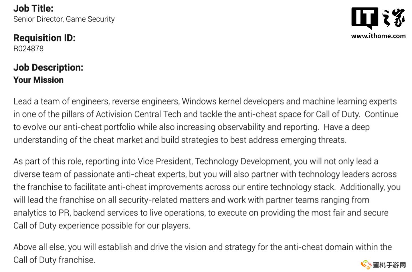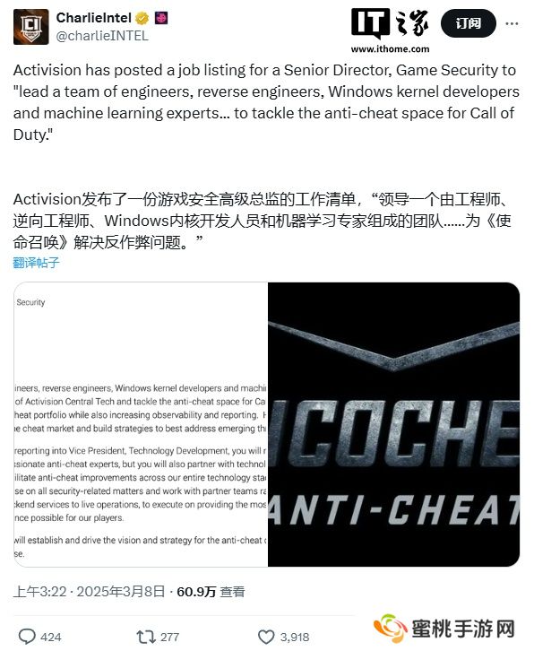 本站 3 月 8 日消息,CharlieIntel 今日发现,动视最近新发布了一则招聘公告,试图找到一名能够帮助解决《使命召唤》**问题的高级游戏安全总监。