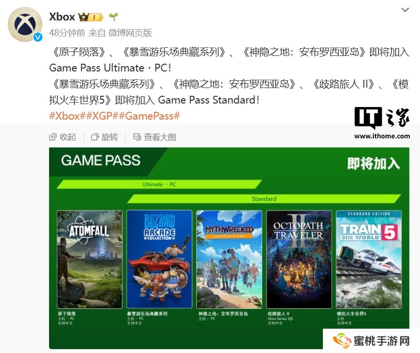 另外根据规划,游戏《原子陨落》《暴雪游乐场典藏系列》《神隐之地:安布罗西亚岛》将加入 Game Pass Ultimate・PC;《暴雪游乐场典藏系列》《神隐之地:安布罗西亚岛》《歧路旅人 II》《模拟火车世界 5》将加入 Game Pass Standard。