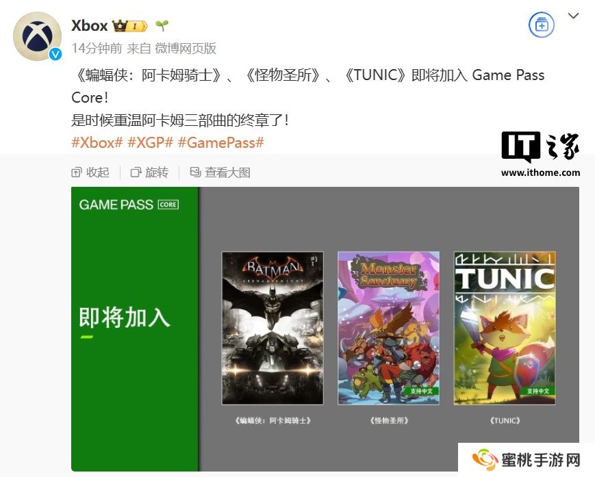 本站 3 月 18 日消息,微软 Xbox 官方微博今日发文宣布,游戏《蝙蝠侠:阿卡姆骑士》《怪物圣所》《TUNIC》即将加入 Game Pass Core。