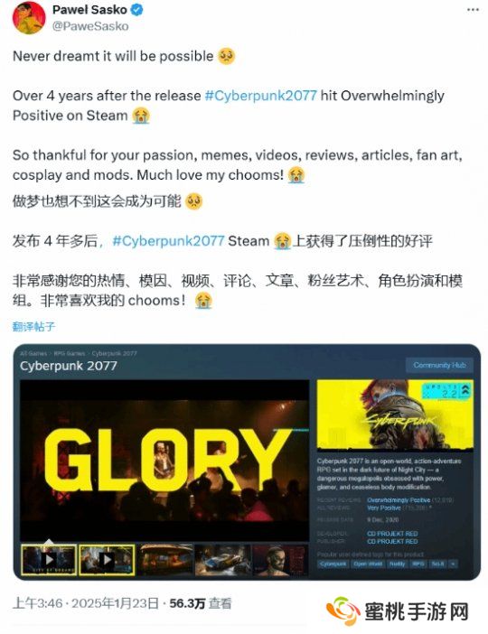 日前,CDPR联合游戏总监Pawel Sasko在X上发布了动态,感慨《赛博朋克2077》在Steam平台的口碑变化。在发售四年多以后,这款首发时曾备受争议的作品,评价已经来到了“好评如潮”。为此,Pawel Sasko再度感谢了玩家们的支持。
