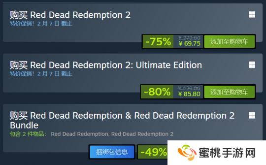 今日,在Steam开启的新史低折扣活动中,原价279元的《荒野大镖客2》,给出了69.75元的2.5折骨折价,促销将截至2月7日。