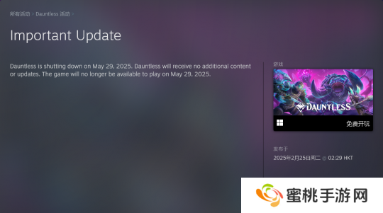 开发商 Phoenix Labs 日前在 Steam 和社交媒体上宣布,免费类怪猎合作动作游戏《无畏(Dauntless)》将于 2025 年 5 月末关服。