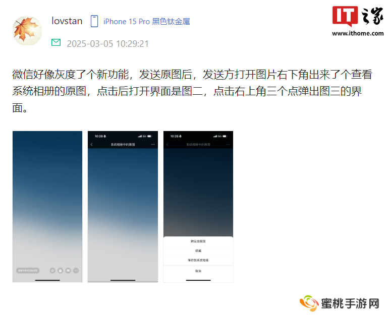微信在发送原图后,发送方打开图片后,左下角新增一个“查看系统相册的原图”的按钮。