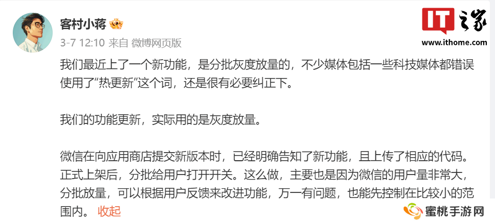 这是因为在 3 月 7 日,腾讯 WXG(微信事业群)员工 @客村小蒋 发博文称微信的功能更新,实际用的是灰度放量。