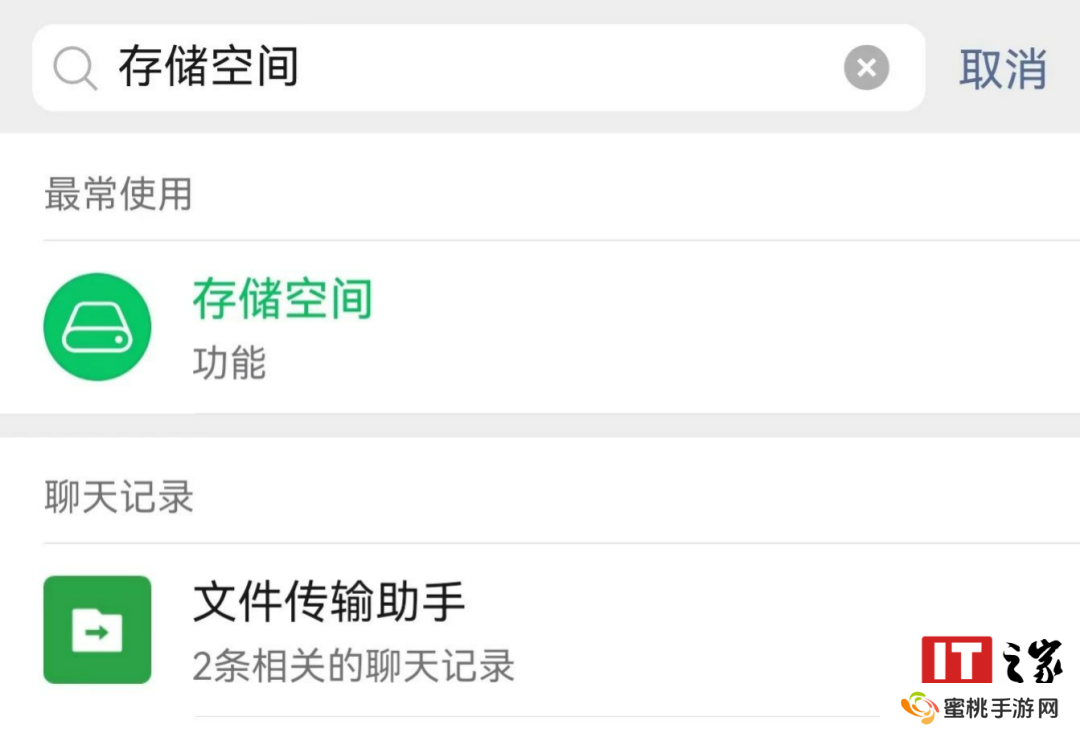 在微信搜索框输入“存储空间”,可看到其功能选项,点击可一键直达存储空间管理页面。