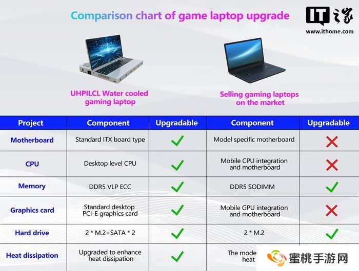 此外,笔记本的 DDR5 内存、M.2 PCIe 5.0 / PCIe 4.0、双 SATA 存储槽和桌面显卡均可升级。原型机支持 PCB 尺寸小于 230mm 的桌面显卡,但需要移除空气散热器并安装水冷头以确保适配。