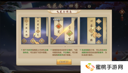 每答对一道题目会加2分,答错一次会扣掉2秒时间。在规定180秒内,按照正确完成的飞花令题目数量所对应的分数发放奖励。完成自己题目的少侠可以点击未回答题目的空缺处为队友进行提示,每个人每轮只能提示一次,每道题目也只能被提示一次。