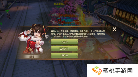 应天时,循古意,江湖即起飞花令!2月18日至2月24日期间,飞花令活动开启,少侠可组成五人队伍前往苏州颂诗处参加飞花令活动。呼朋唤友,飞花接令,参与活动即可获得不菲奖励哦!