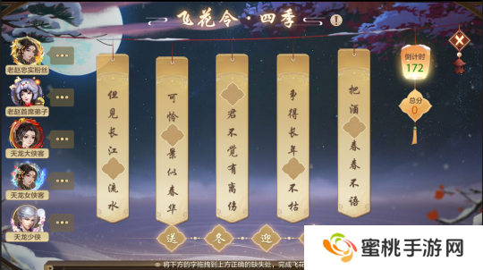 每一轮会刷出五道飞花令题目,少侠需与队友合力完成这五道题目,每个人可以选择完成任意一个未完成的题目,且每个少侠仅