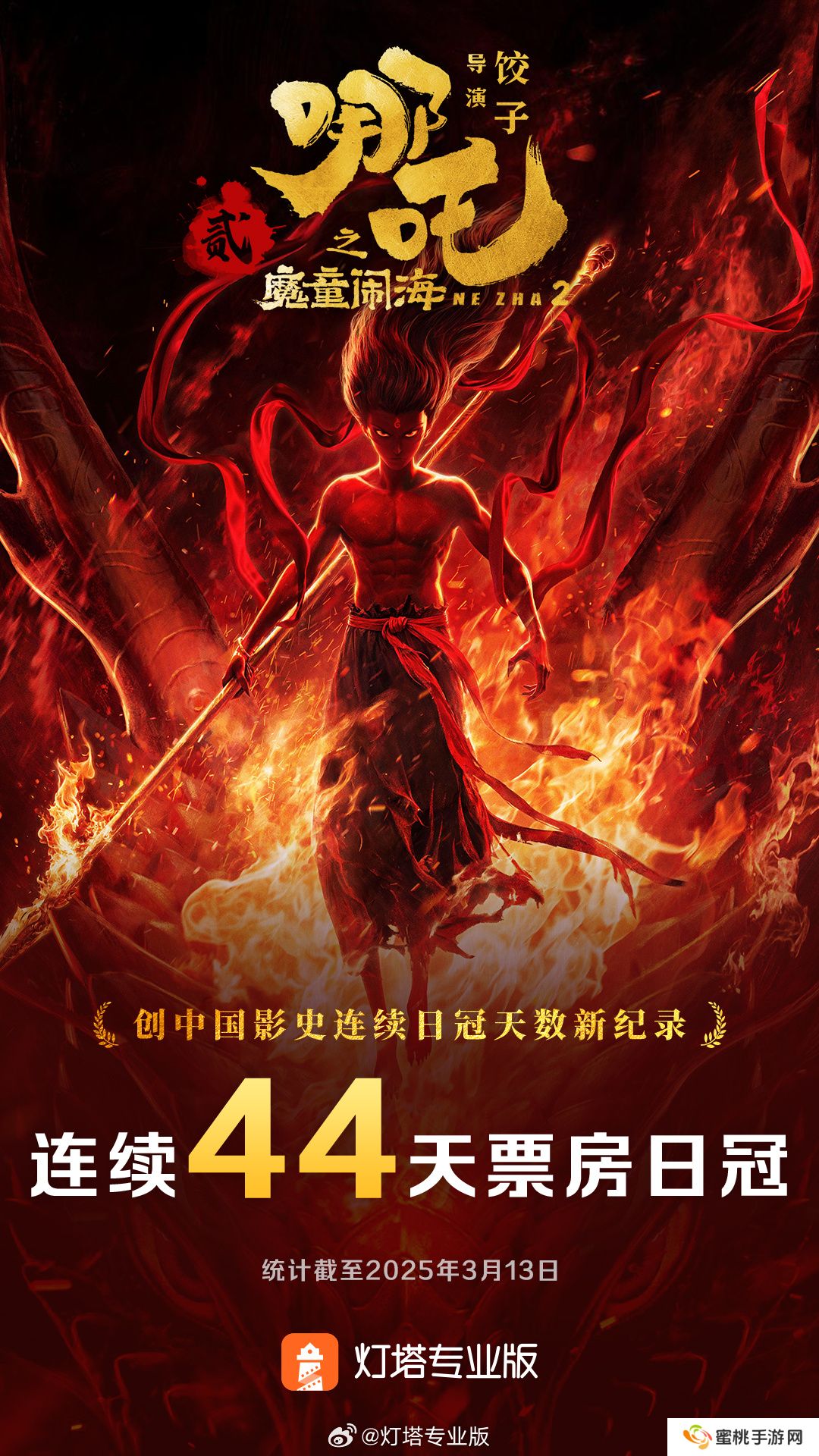 另据灯塔专业版数据,截至 3 月 13 日,《哪吒之魔童闹海》上映 44 天连续登顶单日票房排行,打破有公开数据统计以来中国影史单片连续日冠天数纪录。