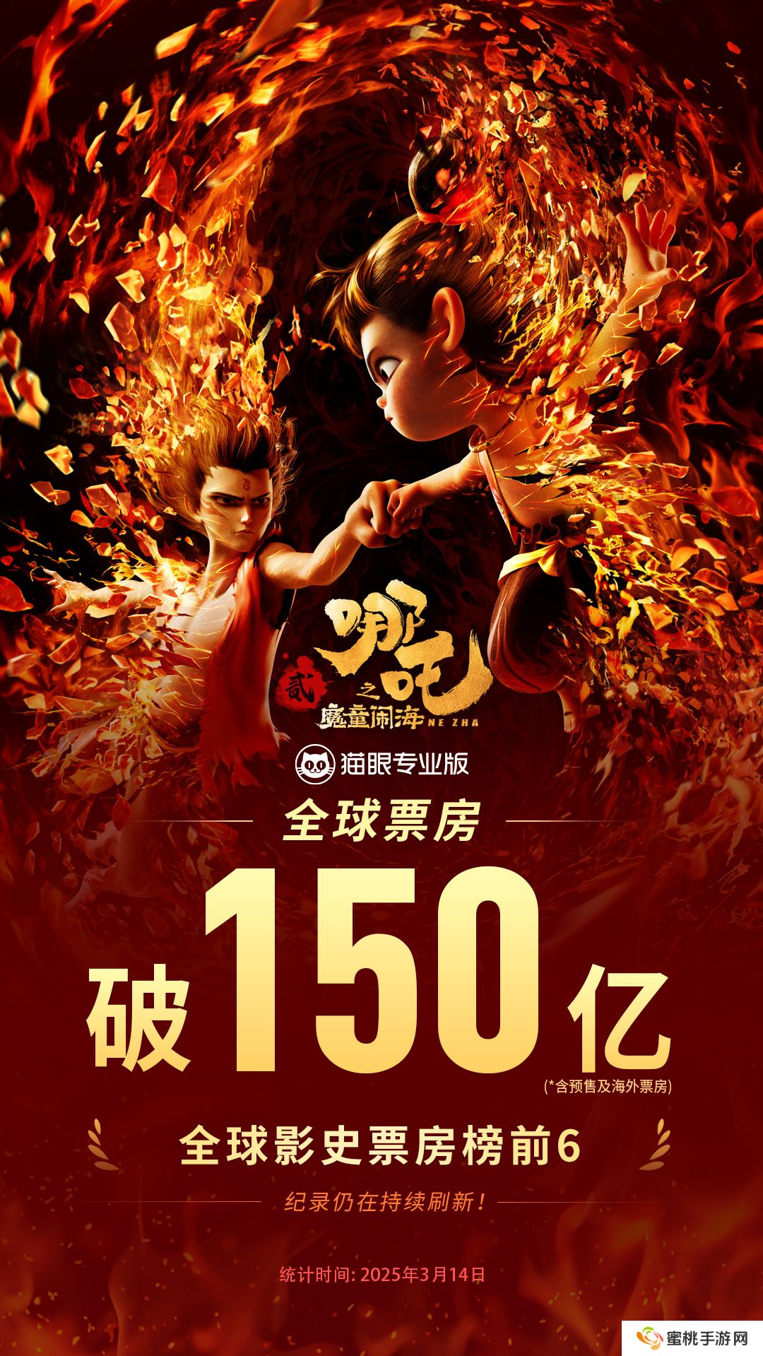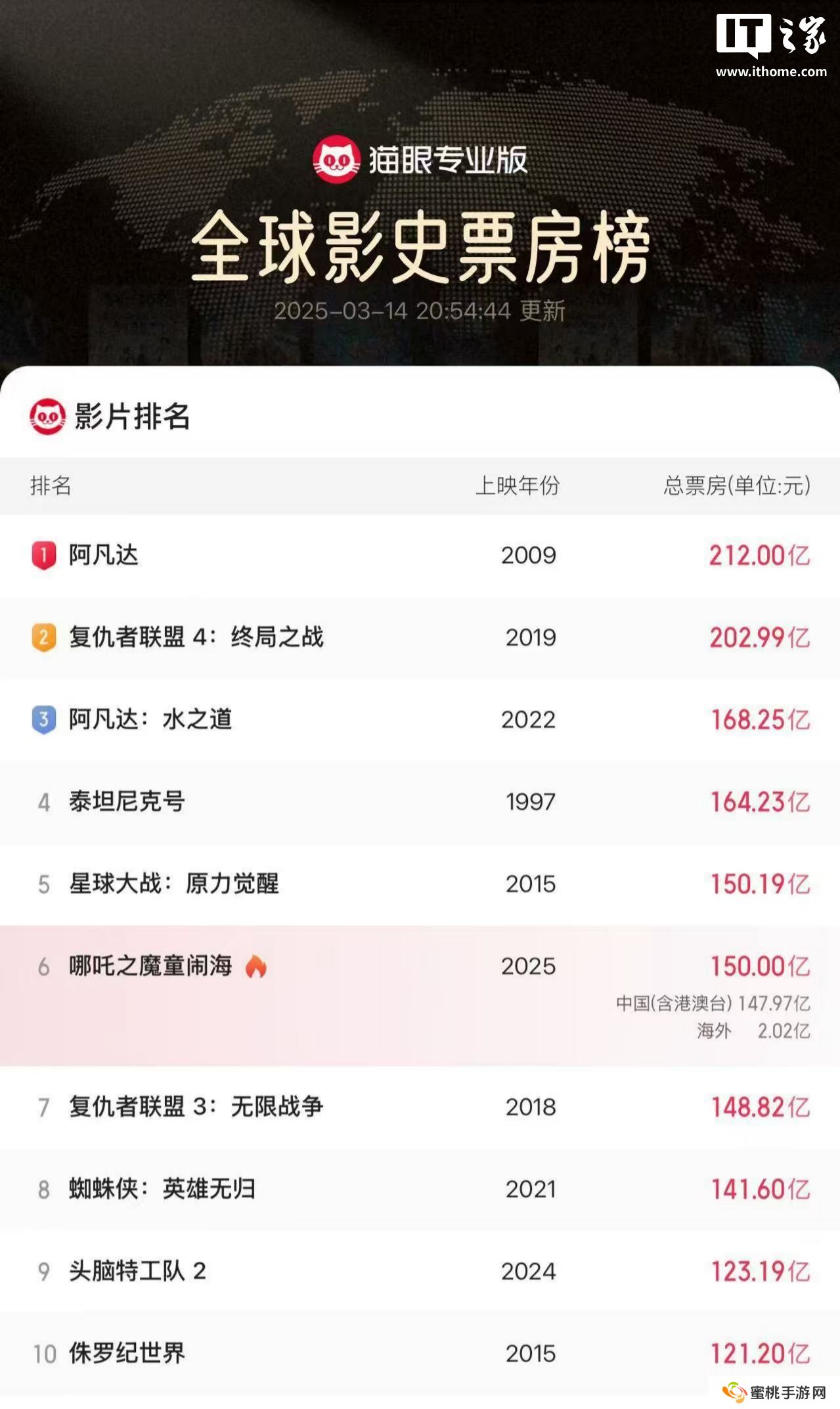 本站 3 月 14 日消息,据猫眼专业版数据,《哪吒之魔童闹海》全球票房(含预售及海外)已破 150 亿,正在冲击全球票房榜第 5 名!