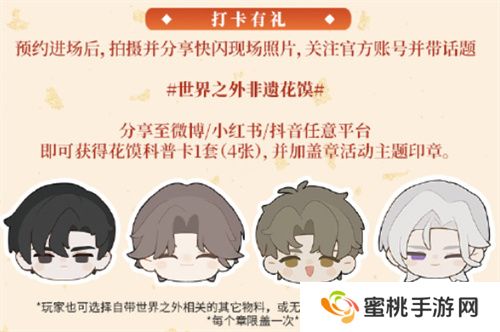 预约进场后,拍摄并分享快闪现场照片,关注世界之外官方账号并带话题#世界之外非遗花馍#分享至微博/小红书/抖音任意平台,即可获得花馍科普卡1套(4张),并加盖章活动主题印章。