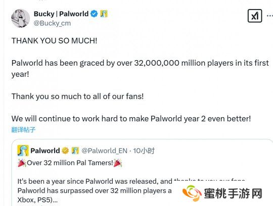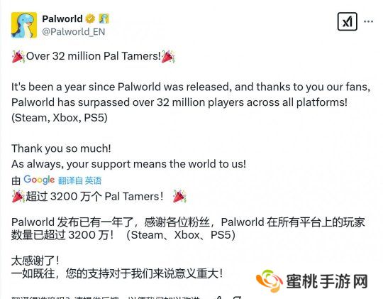 Pocketpair在X上表示:“自《幻兽帕鲁》发售以来,已经过去了一年,感谢我们的粉丝,这款游戏在全平台(Steam、Xbox、PS5)超过了3200万玩家。”