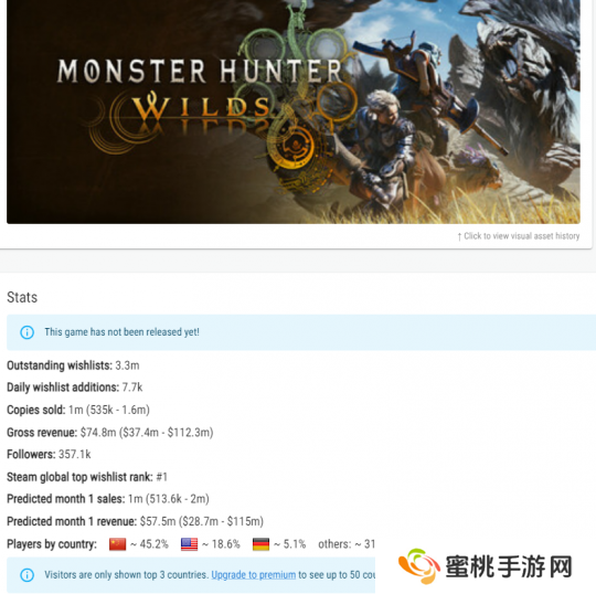 现在据Gamalytic网站数据显示,目前《怪物猎人:荒野》在Steam上的预估预售量已达到100万份,总收入为7480万美元(约合人民币5.42亿元)。国区占比达到45.2%,美国地区占比18.6%。