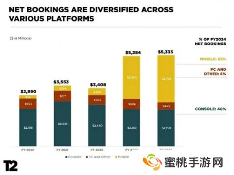 近日据Take-Two新财报数据显示,公司2024财年总收入中,移动平台收入占比高达52%,而主机平台收入占比为40%,PC平台收入仅为8%。