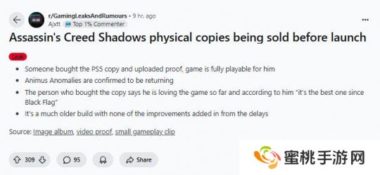 不过目前除了在相关论坛等第三方社交媒体和社区中有着《刺客信条:影》偷跑的消息外,并未有具体的视频截图等内容出现(有PS5实体版游戏出售相关链接,显示为已售出)。