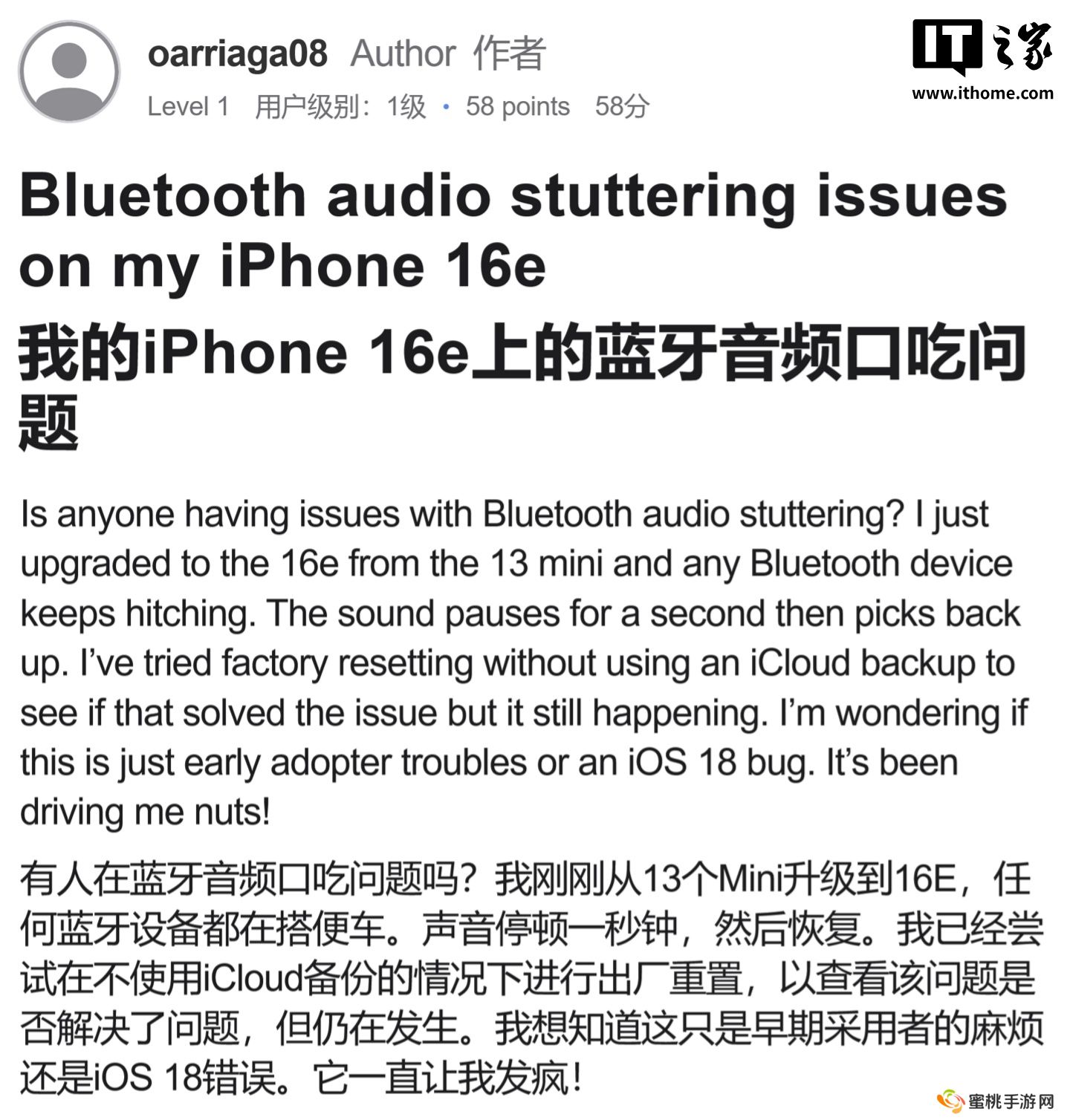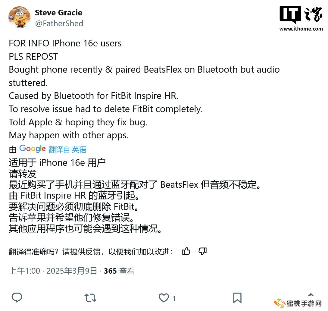 部分苹果 iPhone 16e 用户反馈遇到蓝牙音频卡顿 / 中断问题