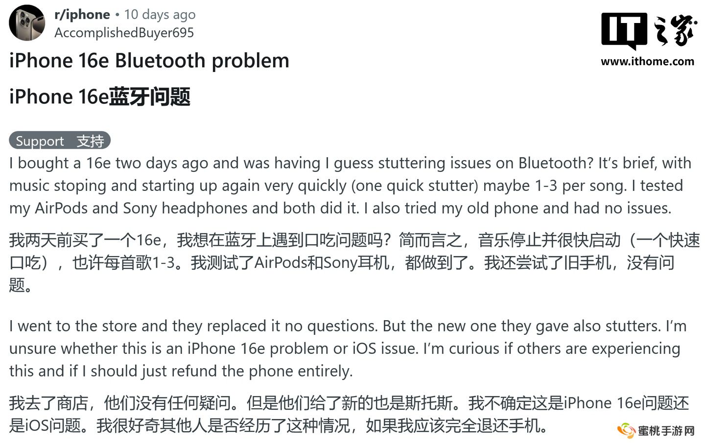 用户在 Apple 支持社区、Reddit 和 X 平台抱怨称,iPhone 16e 连接蓝牙音箱后,音频在播放过程中出现卡顿或中断,影响用户体验。本站附上相关截图如下: