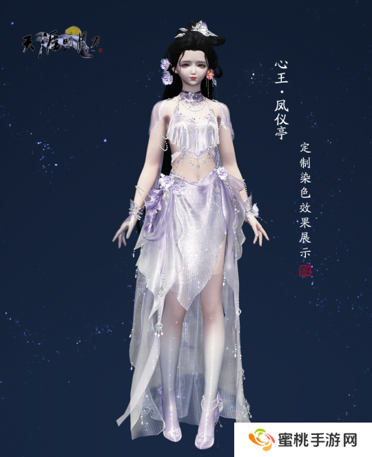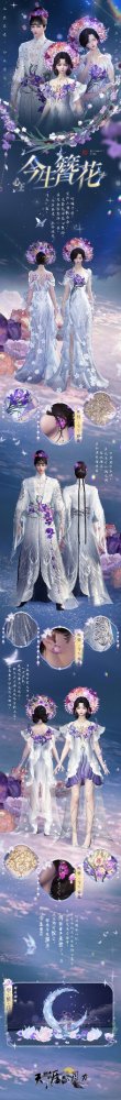 本外观以仙气飘飘的雪色为主色调,绣以银色花纹,精致典雅;白色和紫色立体花朵点缀在胸口和裙摆,头戴簪花围,代表着“今生簪花,即求今生漂亮”的美好祈愿。