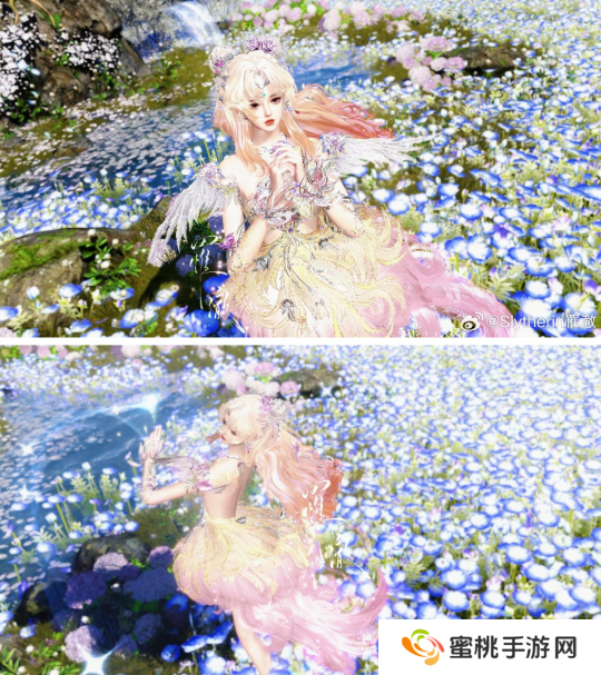 女款甜美可爱,粉黄色系混搭宛如王宫中最美丽灵动的花朵、最绚丽动人的宝石,化为高贵公主衣摆上的点缀,花苞形状的蓬松裙摆、圣洁的双翼无一不衬得女玩家天真烂漫。但看似柔弱的少女却能在拯救心上人时无惧烈焰地狱,勇往直前,这种极致拉扯的剧情,直接把纯爱党看爽了。