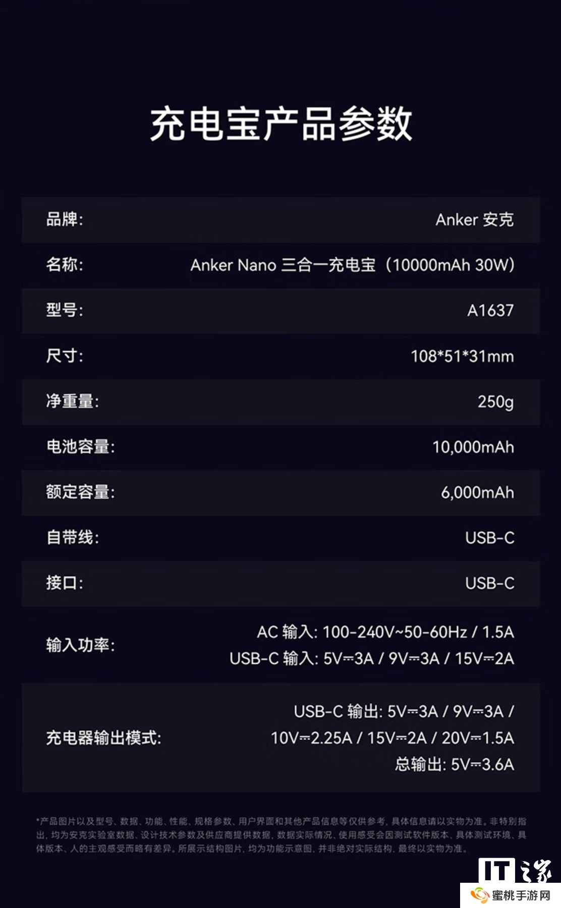 接口方面,该“能量棒”三合一充电头 / 移动电源自带 USB-C线,同时配备一个USB-C接口,支持至高30W输出。