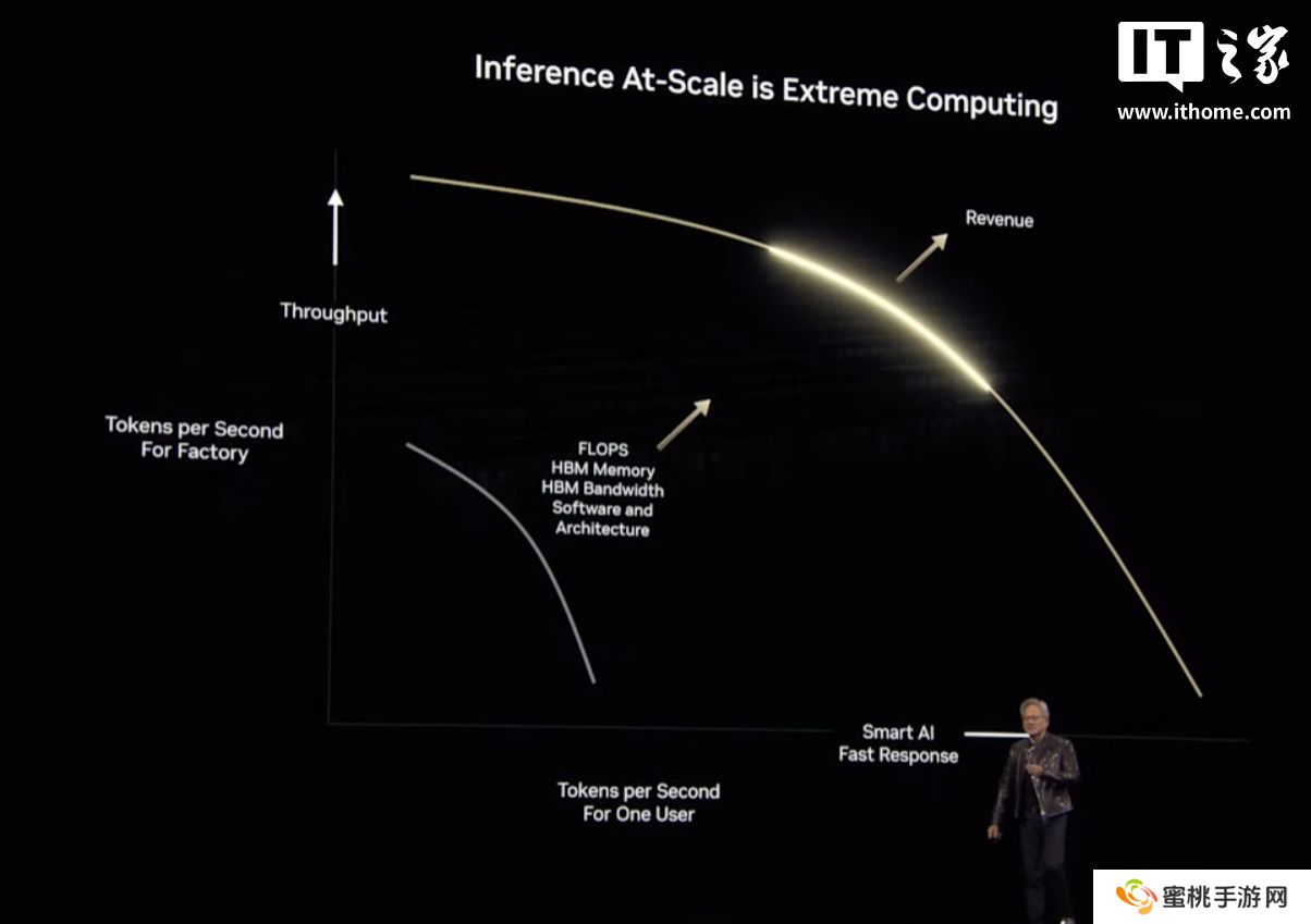 黄仁勋展示了一张关于推理的图表,X 轴显示用户每秒的 Token 数,Y 轴显示工厂每秒的 Token 数。这个问题涉及到大量的 FLOPS 和大量的带宽,这正是英伟达 Blackwell 系统所追求的。