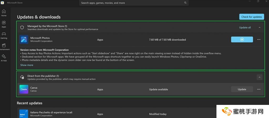 优化下载页面:新增部分用于显示 Microsoft 管理应用的更新(自动应用)和发布者管理应用的更新(可独立更新),便于用户更轻松地管理应用和游戏更新。