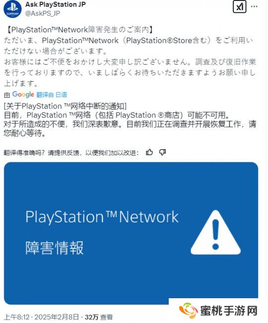 索尼官方已发布消息:“PlayStation网络目前已不可用。对于所造成的不便,我们深表歉意。目前我们正在调查并开展恢复工作,请您耐心等待。”