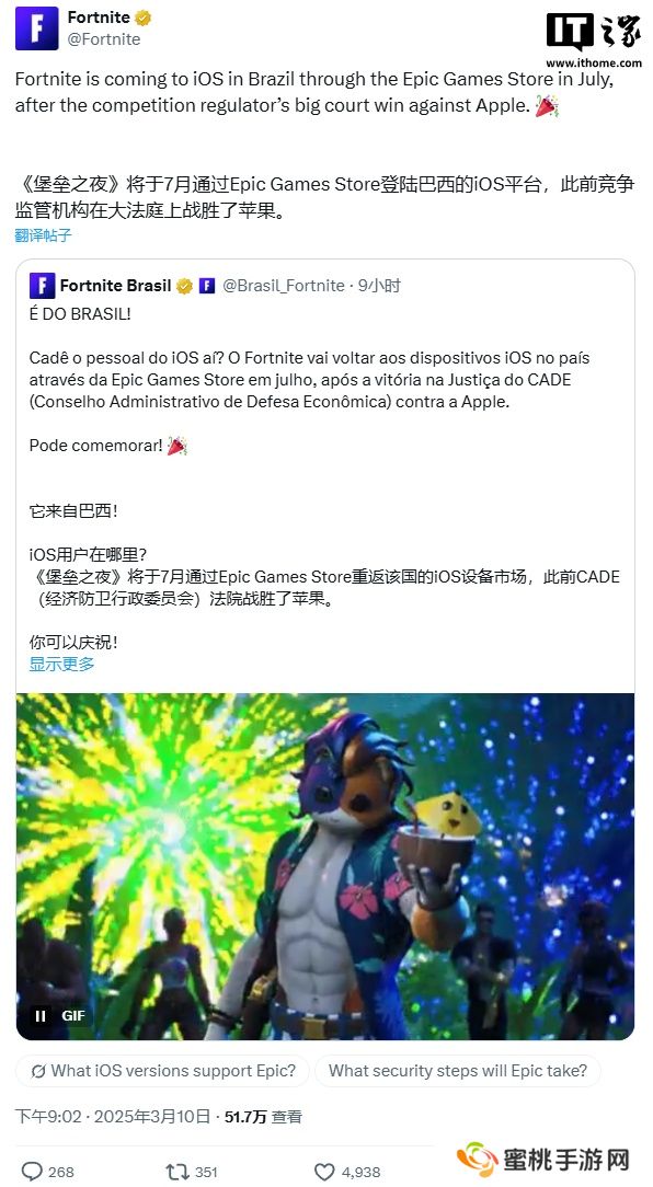 苹果被迫允许侧载后,Epic 宣布《堡垒之夜》将重返巴西 iOS 平台