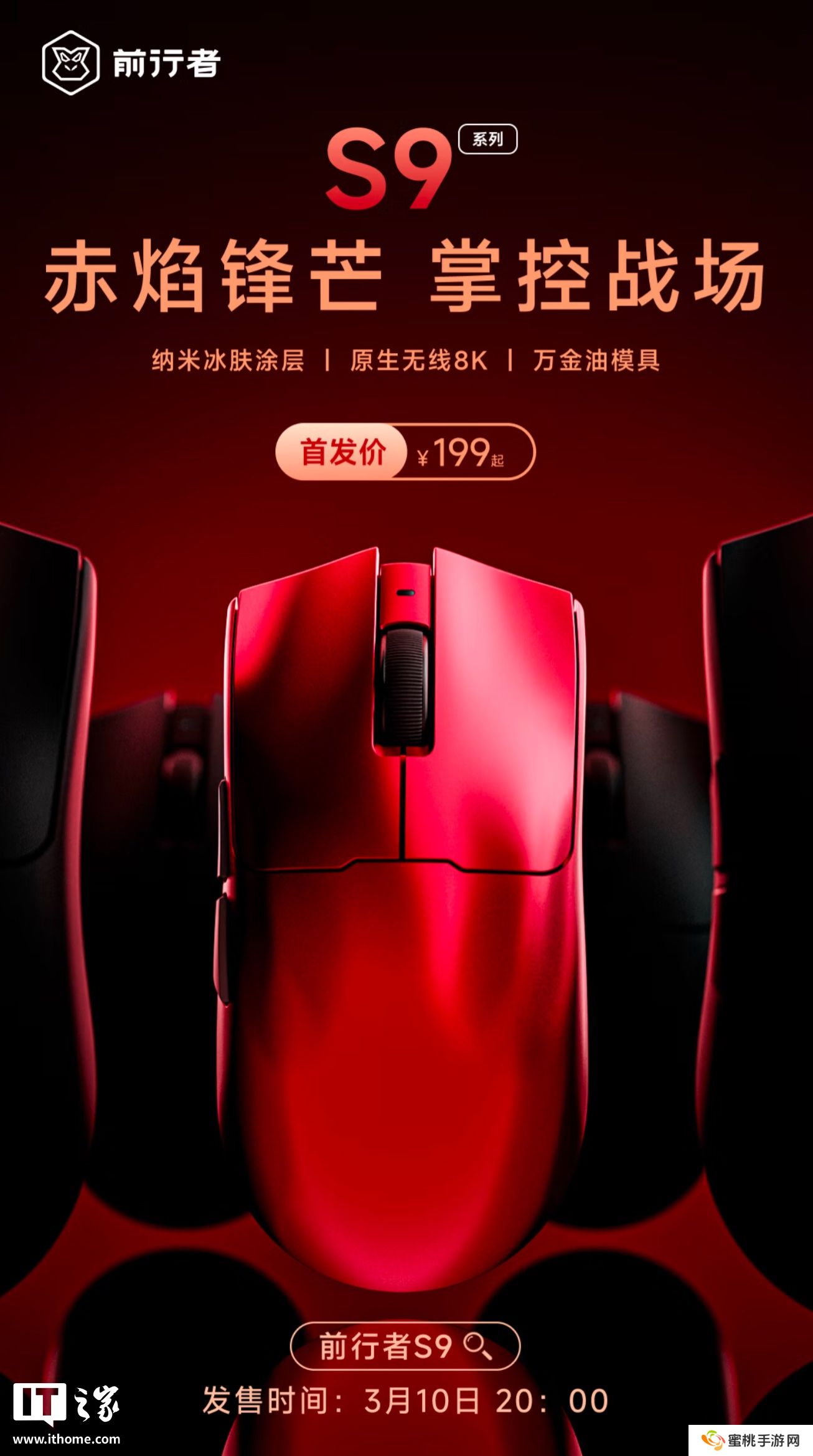 本站 3 月 8 日消息,前行者现已在京东上架 S9 Pro三模游戏鼠标“赤焰红”版本,其配备 PAW3395芯片,定价为199元,将于 3 月 10 日晚 8 点首销。