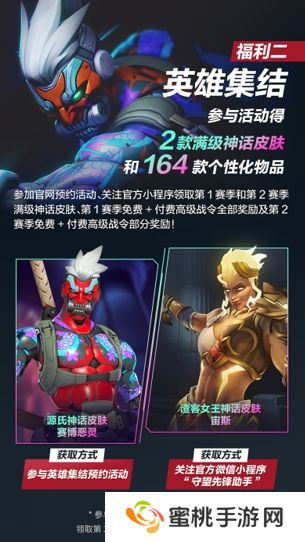 现在参与官网回归预约活动、关注官方微信小程序活动,以及网易大神、企业微信等相关活动,还可免费再得第1赛季、第2赛季的对应赛季神话皮肤和免费+付费高级战令全部奖励。2款满级神话皮肤——源氏神话皮肤“赛博恶灵”(4级)和渣客女王神话皮肤“宙斯”(4级)及共计164款个性化物品都可在2月19日游戏开服后登录领取,千万不要错过!