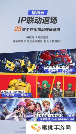 同时,多项IP联动也将返场,23款个性化物品登录就送。2月19日-3月4日(第1、2周),《变形金刚》联动中的6款个性化物品将返场;3月5日-3月18日(第3、4周),《一拳超人》联动中包含士兵:76皮肤“无证骑士”在内的6款个性化物品将返场;3月19日-4月1日(第5、6周),“LE SSERAFIM”联动中包含狂鼠皮肤“法尔克西·詹姆斯”在内的11款个性化物品将返场。IP联动返场活动同样在指定时间内开放,错过活动将无法获取奖励。