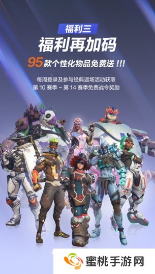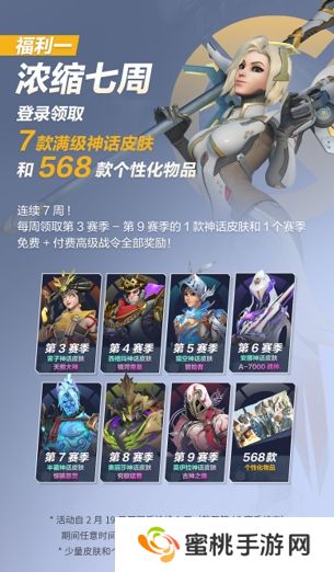 2月19日《守望先锋》国服开服后,每周登录游戏均可领取第3赛季-第9赛季中的一个对应赛季神话皮肤和一个赛季的免费+付费高级战令全部奖励。奖励可连续领取7周,共计7款满级神话皮肤和568款个性化物品。活动持续9周,截至第15赛季结束,在前7周就会将奖励更新完毕。并且,玩家在活动期间的任意时间登录游戏都能领取之前更新的所有登录奖励,不用担心错过!