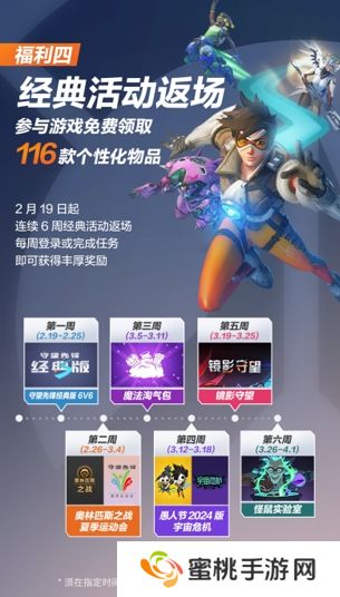 开服盛典,自然不能少了经典活动相伴。2月19日开服后,每周都有不同的经典活动开放。参与陆续开放的守望先锋经典版6V6、魔法淘气包、镜影守望等活动,共计可获得116款个性化物品。需要注意的是,经典活动在指定时间内开放,错过活动将无法获取奖励。