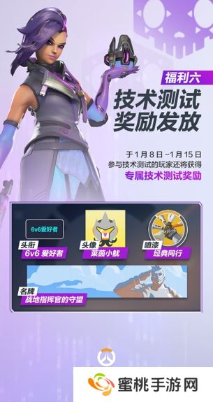 2月19日开服后,参与了不限号技术测试的玩家还将获得专属技术测试奖励——【头衔】6v6爱好者、【名牌】战地指挥官的守望、【头像】莱茵小鱿、【喷漆】经典同心。