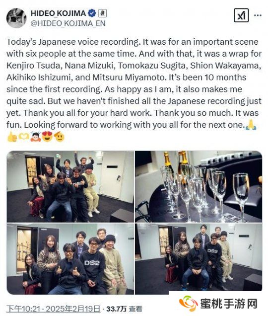 近日,小岛秀夫在X上发文更新了《死亡搁浅2:冥滩之上》的开发进度,游戏针对一个重要场景进行了日语配音的录制,共有六人参与了配音,分别是津田健二郎(山姆)、水树奈奈(芙拉吉尔)、杉田智和(Dollman?)、若山诗音(明日)、石住晶彦(亡人)、宫本充(Tarman),小岛秀夫还晒出了与各位配音演员的合照。
