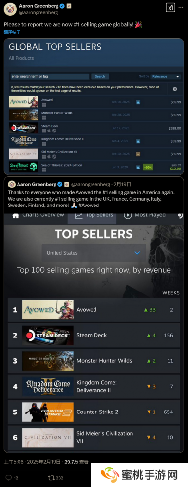 微软游戏营销副总裁 Aaron Greenberg 日前在社交媒体上发帖称,由黑曜石工作室开发的角色扮演动作 FPS 游戏《宣誓》已在美国、英国、法国、德国、意大利、瑞典和芬兰等地登上了 Steam 畅销榜榜首。